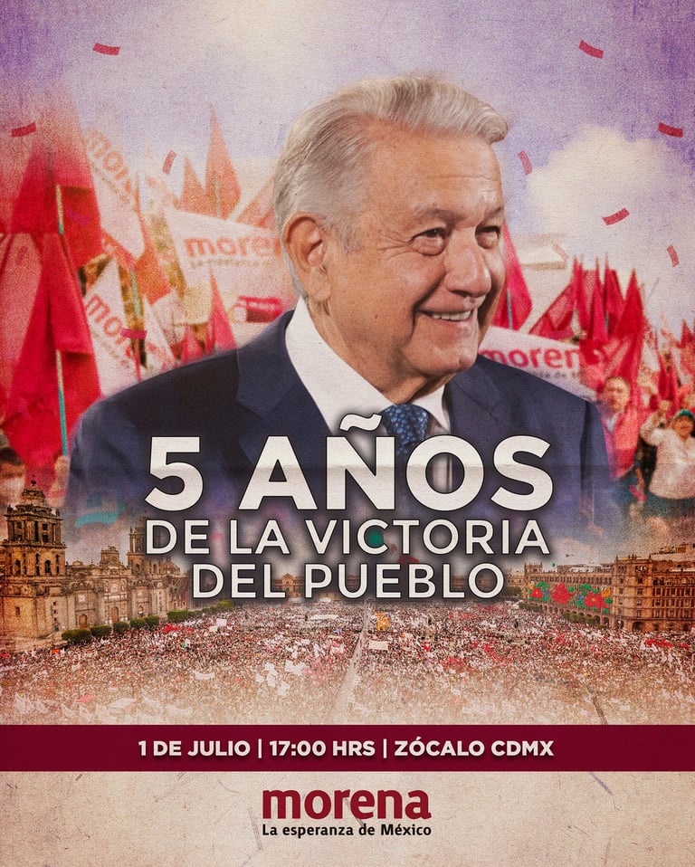 La voluntad y la esperanza del pueblo inundaron las urnas en 2018 y con ello empezó la Cuarta Transformación de nuestro país. Estamos todas y todos invitados a celebrar estos 5 años de victorias para el pueblo de México. Nos vemos el sábado a las 17:00 hrs en el Zócalo.