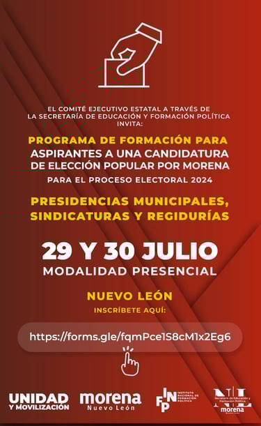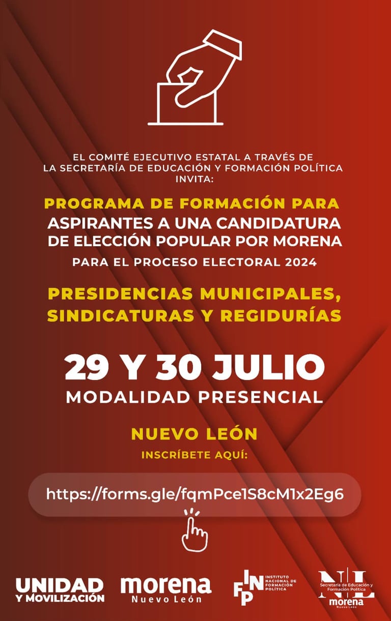 El comité ejecutivo Estatal de Nuevo León a través de la Secretaría de Formación y Educación Política Invita al: Programa de Formación para aspirantes a una candidatura de elección popular de Morena para el proceso electoral del 2024